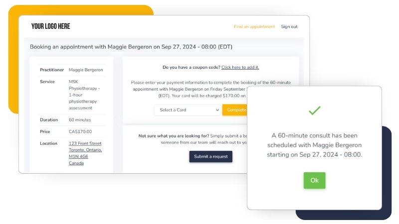 Protect patient information with Embodia’s secure platform. Our healthcare scheduling and booking system complies with all relevant regulations, including HIPAA, PIPEDA, and PHIPA, ensuring that your practice maintains high standards of data security and confidentiality.